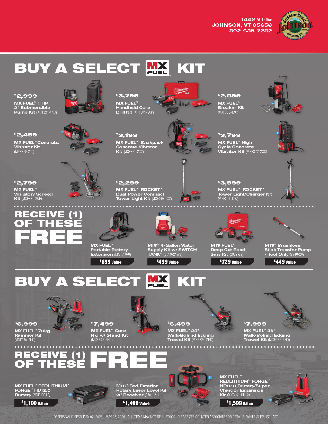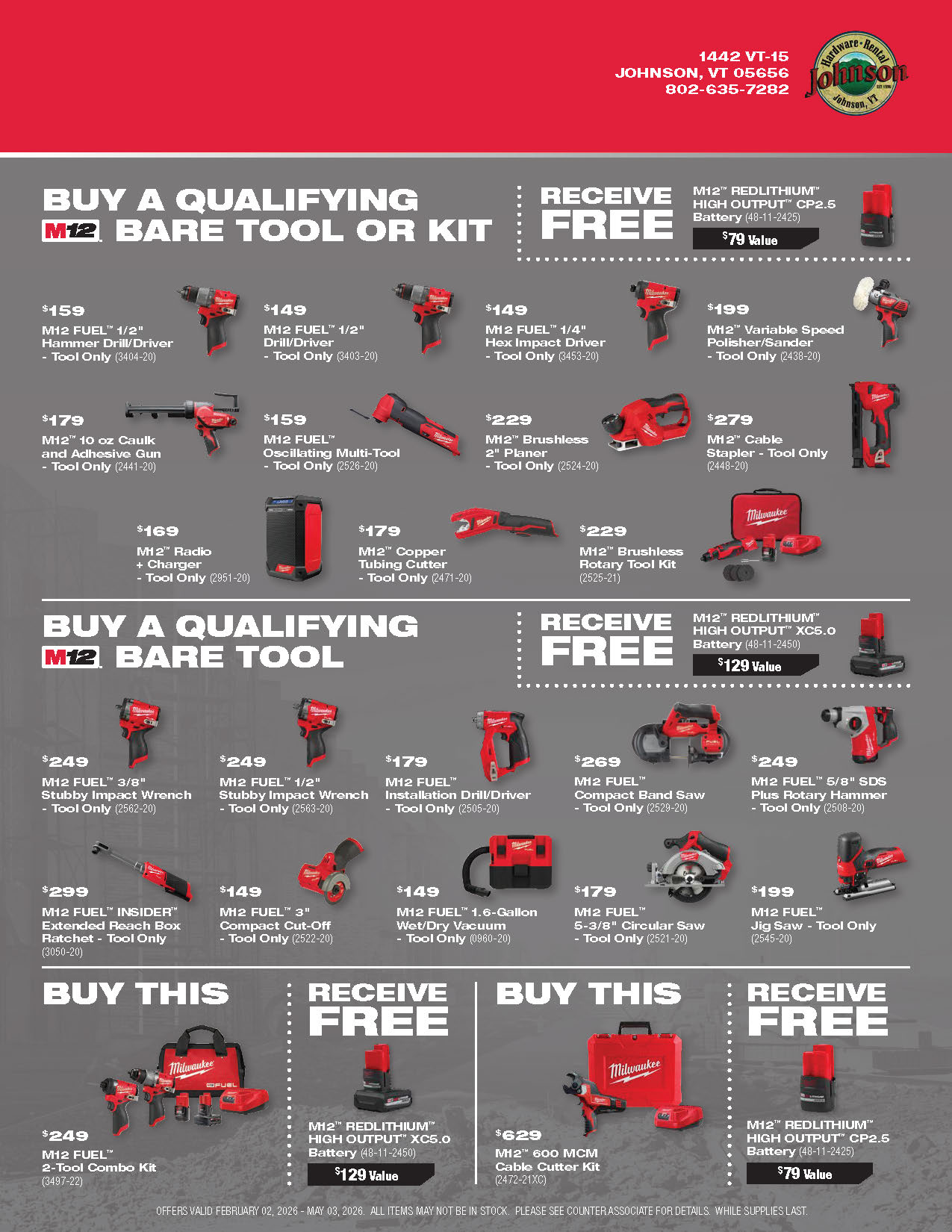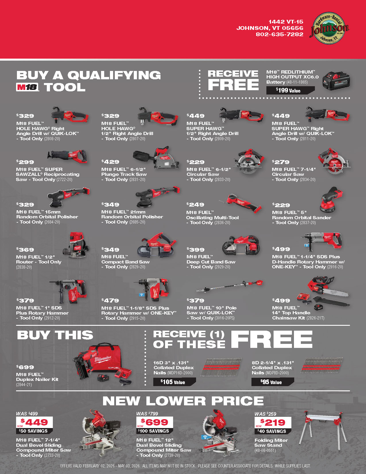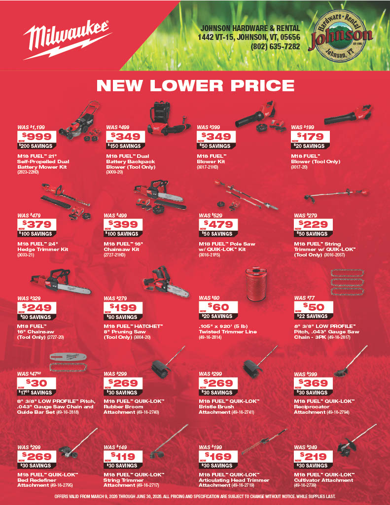 Explore the latest Milwaukee tool promotions at Johnson Hardware & Rental, your go-to destination for pro-grade tools in Johnson, Vermont. As New England’s largest Milwaukee tool store and an authorized Milwaukee tool warranty repair center, we offer a deep selection of cordless tools, batteries, combo kits, and accessories with rotating in-store specials. These promotions are available only while supplies last, so you’ll always find fresh deals on the tools you rely on for home projects, contracting work, or municipal jobs. Our knowledgeable, locally rooted team is here to help you choose the right Milwaukee setup and make sure you get the most value out of every promotion. Stop in and see why customers from across Vermont and beyond say the trip to Johnson is worth it.