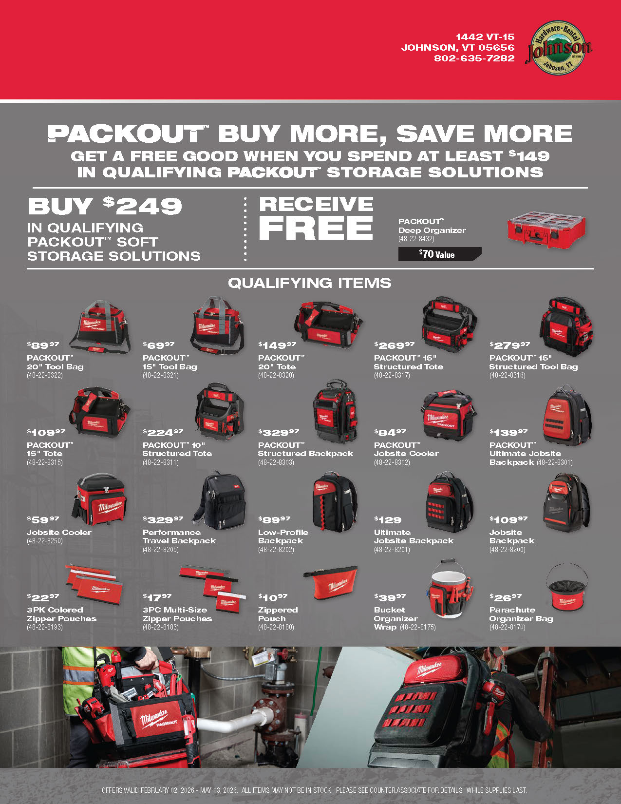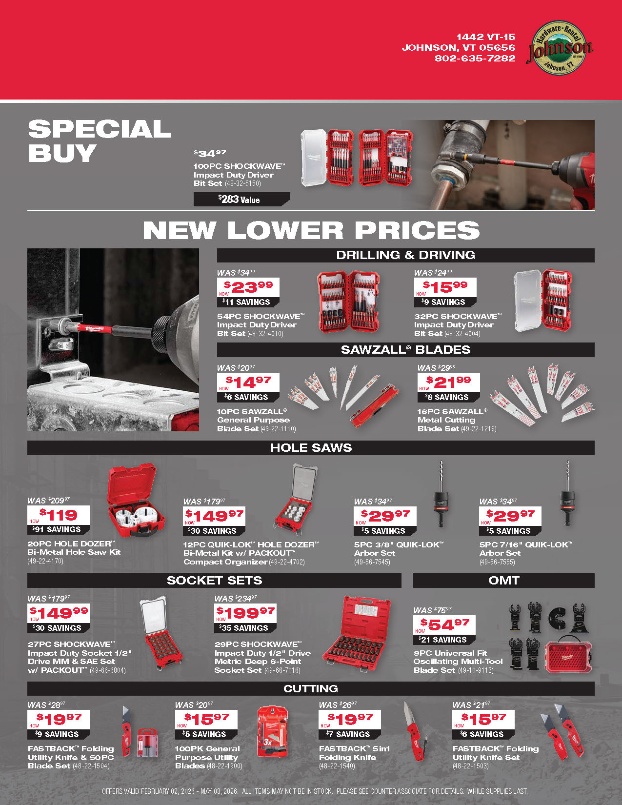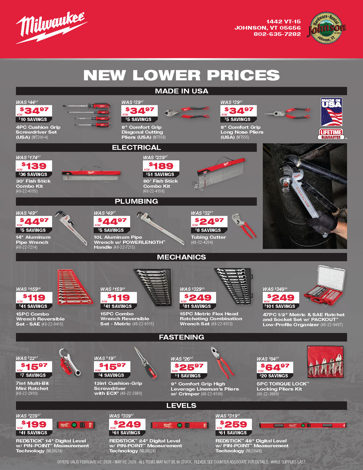 Explore the latest Milwaukee tool promotions at Johnson Hardware & Rental, your go-to destination for pro-grade tools in Johnson, Vermont. As New England’s largest Milwaukee tool store and an authorized Milwaukee tool warranty repair center, we offer a deep selection of cordless tools, batteries, combo kits, and accessories with rotating in-store specials. These promotions are available only while supplies last, so you’ll always find fresh deals on the tools you rely on for home projects, contracting work, or municipal jobs. Our knowledgeable, locally rooted team is here to help you choose the right Milwaukee setup and make sure you get the most value out of every promotion. Stop in and see why customers from across Vermont and beyond say the trip to Johnson is worth it.